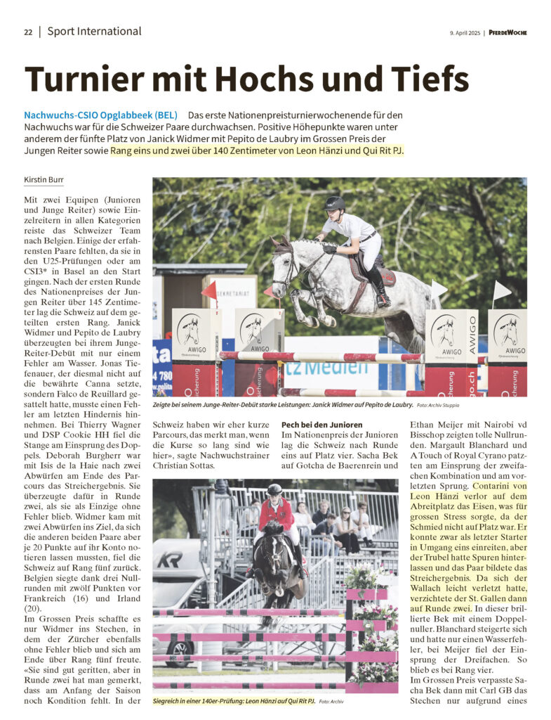 Leon wurde für den ersten CSIO-Einsatz in Opglabbeek in diesem Jahr nominiert. Mit seiner Stute Qui Rit PJ konnte er einen Sieg über 1.40m einfahren sowie einen 2. Platz über die nämliche Höhe verbuchen. Im Nationenpreis selber, hatten er und sein Wallach Contarini leider nicht so viel Glück, riss sich Dieser doch beim Abreiten ein Eisen ab und verletzte sich dabei leicht, so dass er in der zweiten Runde nicht mehr antreten konnte. Wir hoffen nun, auf eine schnelle Genesung von Contarini und freuen uns auf die weiteren Einsätze.